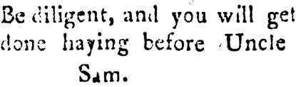 Further digging in the databases may fill out the picture of how "Uncle Sam" first spread. Interestingly, "Uncle Sam" may have been a stock character in New England even before it came to stand for the United States. In Howe's Almanac for the Year of Our Lord, 1808 (published by John Howe in Greenwich, Mass. in 1807), the following advice is given on the calendar for the days of July 12-14: "Be diligent, and you will get done haying before Uncle Sam."