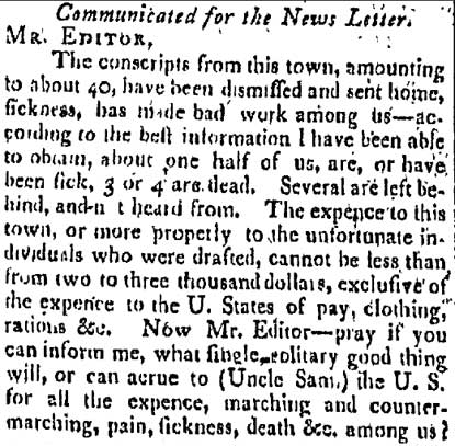 The Bennington example was discovered in a newspaper database several years ago by inveterate word sleuth Barry Popik. It appears in a letter to the editor from an anonymous conscript in the War of 1812, who is less than sanguine about the war effort.