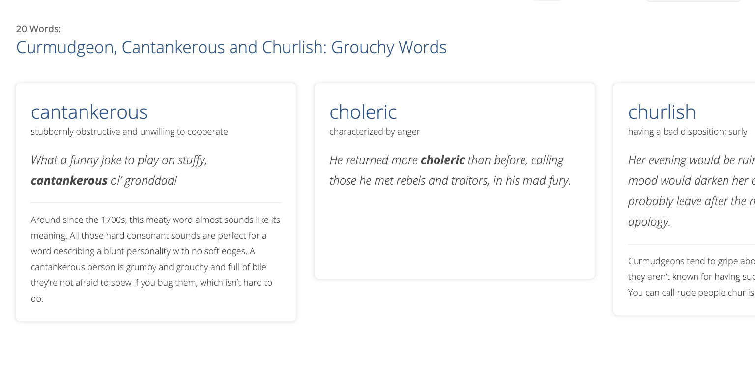 While we're on a collection page, take a moment to click the "Explore the Words" tab. Here you'll find a bird's-eye view of all the words in this collection, organized by list. Each word appears on a card, with its primary definition, an example sentence, and any notes that were included with the list. Click on any word to go to the dictionary entry for that word.