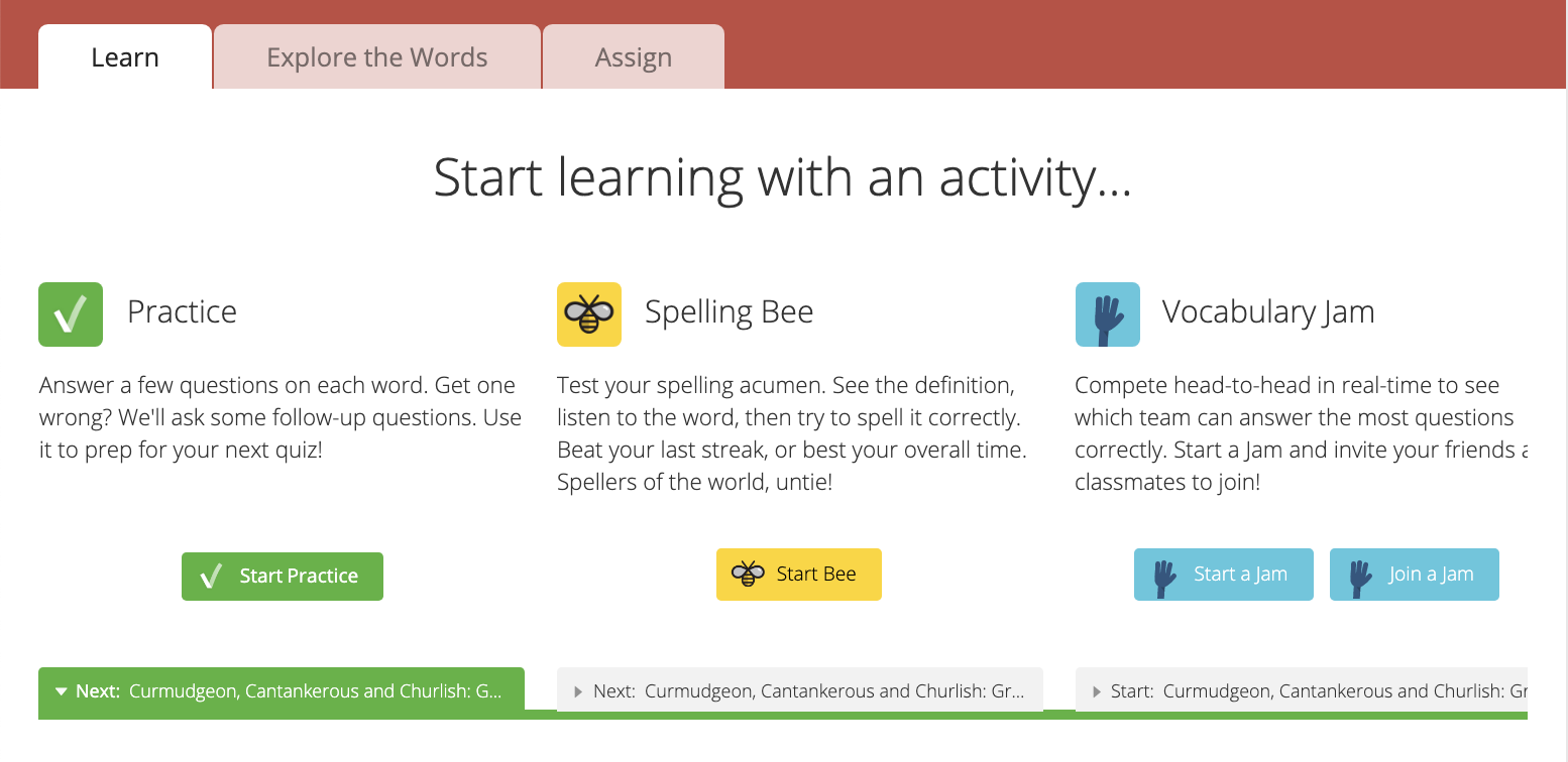 When you get to a collection that contains lists that you'd like to learn, you can start an activity right from the collection page. Simply click "Start Practice" to get practicing on the first list in the collection. We'll keep track of your progress on each list in the collection as you... err... make progress. (Of course you can also start other activities like Spelling Bees and Vocabulary Jams from a collection page too.)
