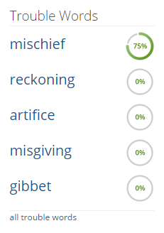 On the right hand side, you'll see a list of the words that give you most the trouble (ranked by how troublesome they are for you), as well as a list of recently mastered words.