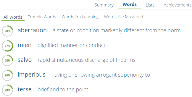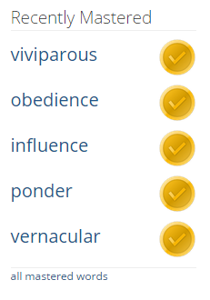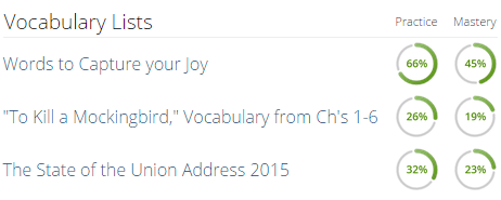 You'll also see all the progress you've made on vocabulary lists that you're learning. (We keep track of your progress on each list both as a practice activity and in terms of overall progress toward mastering those words on Vocabulary.com. We set the bar higher for overall mastery, so those percentages may differ.)
