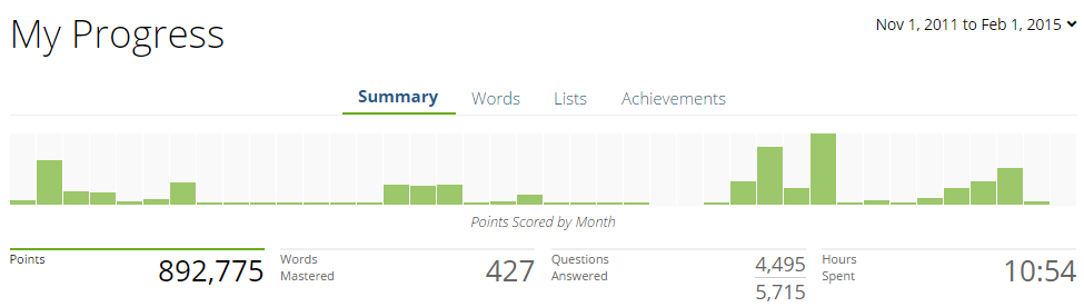 When you are logged in, clicking on "My Progress" in the top right corner will take you to a summary page that gives you a handy overview of your activity on Vocabulary.com. At the top of the page, you'll see an interactive timeline of your progress, and under that is information about the points you have scored, the words you have mastered, the number of questions you have answered correctly and incorrectly, and total time spent playing Vocabulary.com.