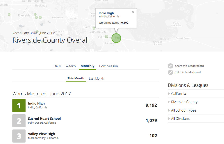 That makes it the perfect time to announce our brand spankin' new County Leaderboards! Now your school can see how it stacks up against others in — you guessed it — your county, meaning that the Vocabulary Bowl is more local than ever before.