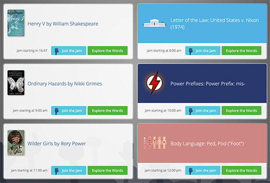 Well, starting today, you can play and compete with fellow Jammers from around the world! All you do is go to https://vocab.com/jam and join the next public scheduled Jam. There's one starting every ten minutes! That's right — we're automatically creating 10-question Vocabulary Jams from our most recently featured lists, collections, and books. Got a few minutes before the next Jam starts? Click on "Explore the Words" to peruse the words that might show up in the Jam. When you're ready to go, click "Join the Jam" and get ready for the action.