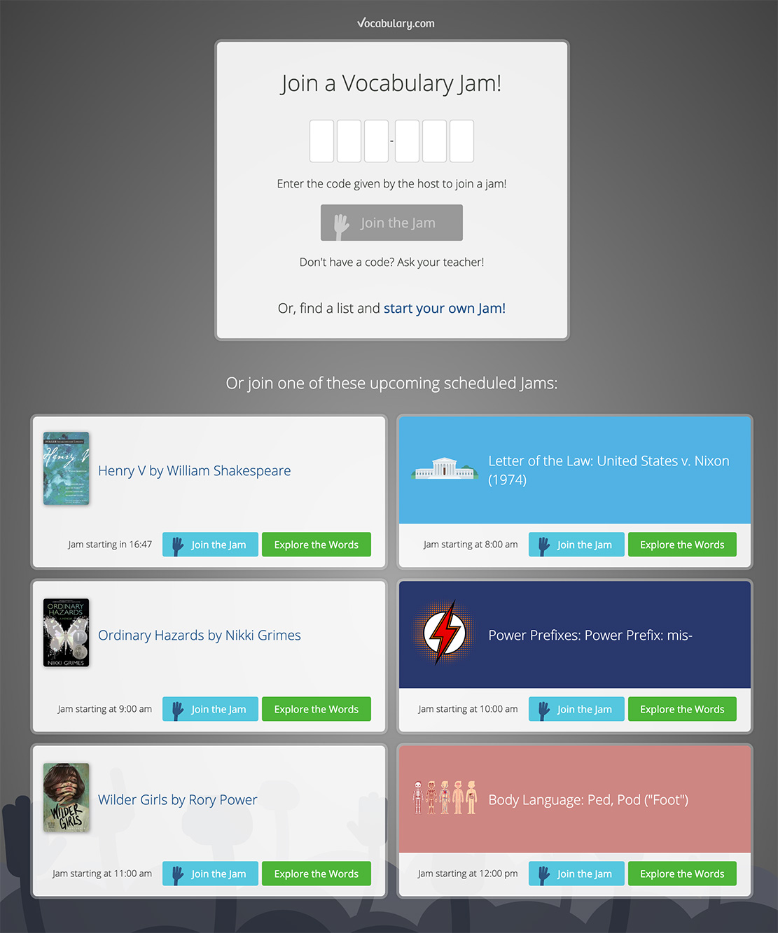 Well, starting today, you can play and compete with fellow Jammers from around the world! All you do is go to https://vocab.com/jam and join the next public scheduled Jam. There's one starting every ten minutes! That's right — we're automatically creating 10-question Vocabulary Jams from our most recently featured lists, collections, and books. Got a few minutes before the next Jam starts? Click on "Explore the Words" to peruse the words that might show up in the Jam. When you're ready to go, click "Join the Jam" and get ready for the action.