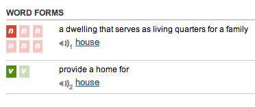 On the Dictionary page for house, for example, you can see that we're splitting out the two pronunciations of that word on the right. Click on the speaker icon to hear each pronunciation and quickly distinguish the meaning of one from the other. And hover over the part-of-speech boxes to see exactly which meanings go with which variant.