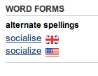 This new feature is handy in addressing variations in spelling as well, including US and UK variants. Look up socialize, and you'll see its UK spelling socialise right up next to the Union Jack, while the US socialize is aligned with the Stars and Stripes.
