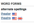 Sometimes spelling variants don't break down so easily. Take theater and theatre. The theater form is typically found in the US, but theatre can be found in both the US and the UK. In order to indicate that, we show the UK flag next to theatre and both countries' flags side by side for theatre. Who says the US and UK have to be countries separated by a common language?