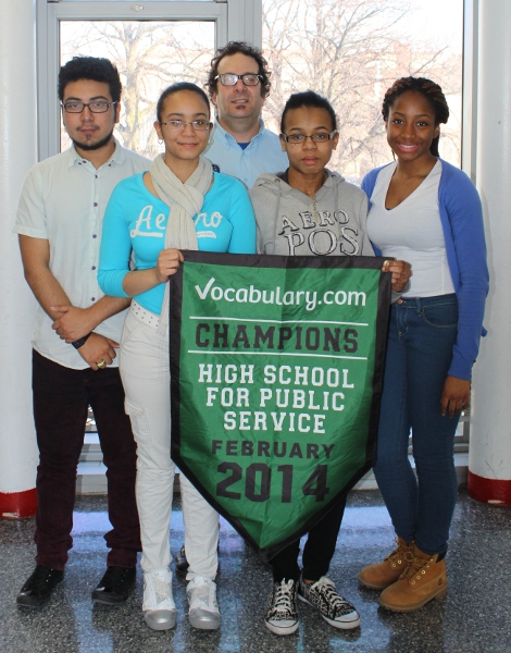 As is usually the case with schools engaged in fierce Vocabulary.com play, of course, a few high scoring students led the march towards victory. At HSPS, Nicole Caster, Anaiah Davis, Tiana Dixon, Jair Farciert, Rebecca Joseph, Keine Hospedales, Ana Minaya, and Shanine Mondesir were honored for earning more than a million points in the game. (Eleventh graders are pictured here.) After the ceremony was over, one student even recalled a night he played both on his computer and his phone.
