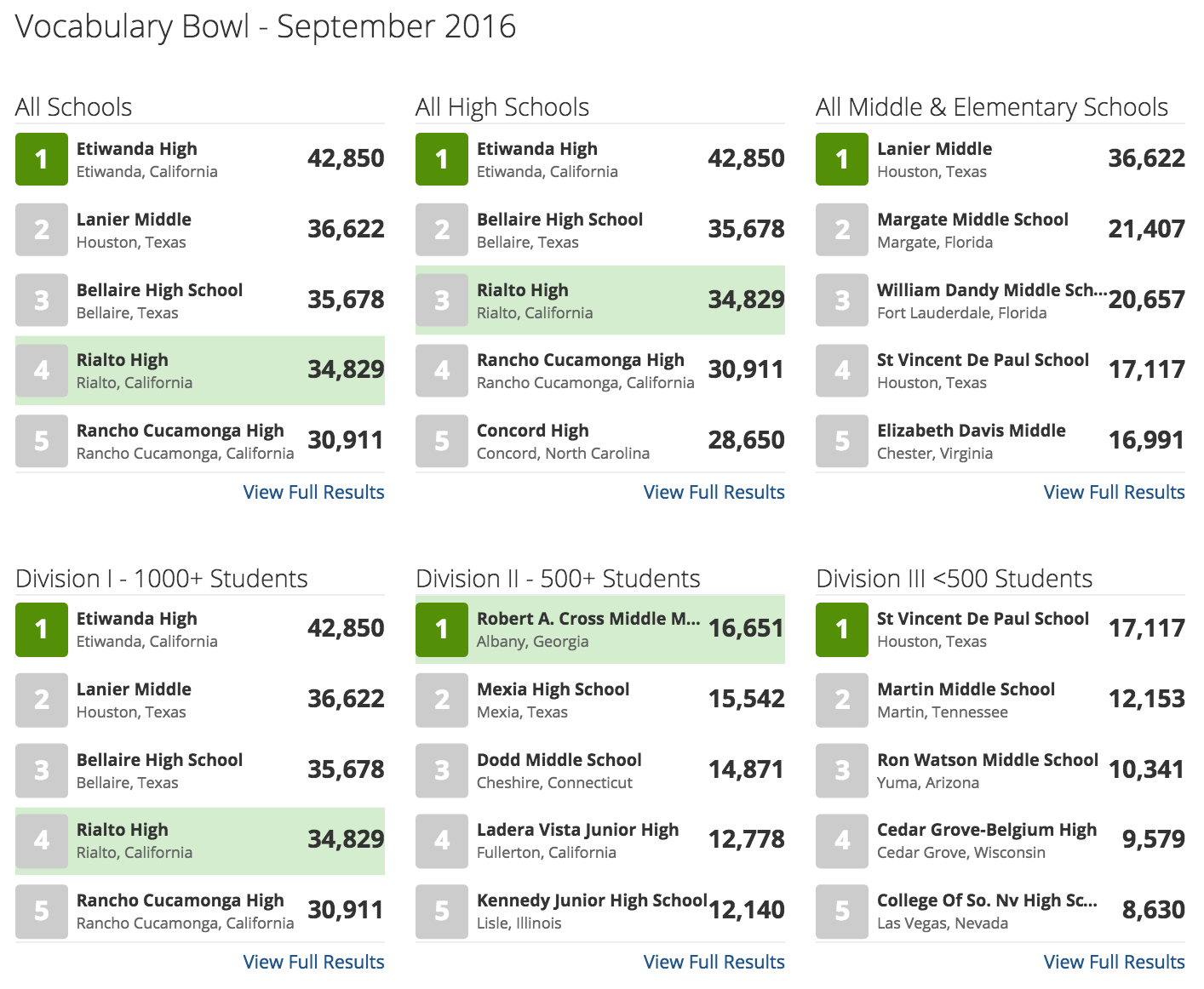This year, thanks to the enthusiasm we've seen for the Bowl in schools across the US and Canada, we've created new divisions based on school type and school size. Now you can follow the rankings among all High Schools as well as all Middle / Elementary Schools. We've also added Divisions I, II, and III based on student enrollment, meaning that whether your school is large or small, you've got a playing field to match. Each new division has its own leaderboard that makes following the standings more exciting for every player in every school.