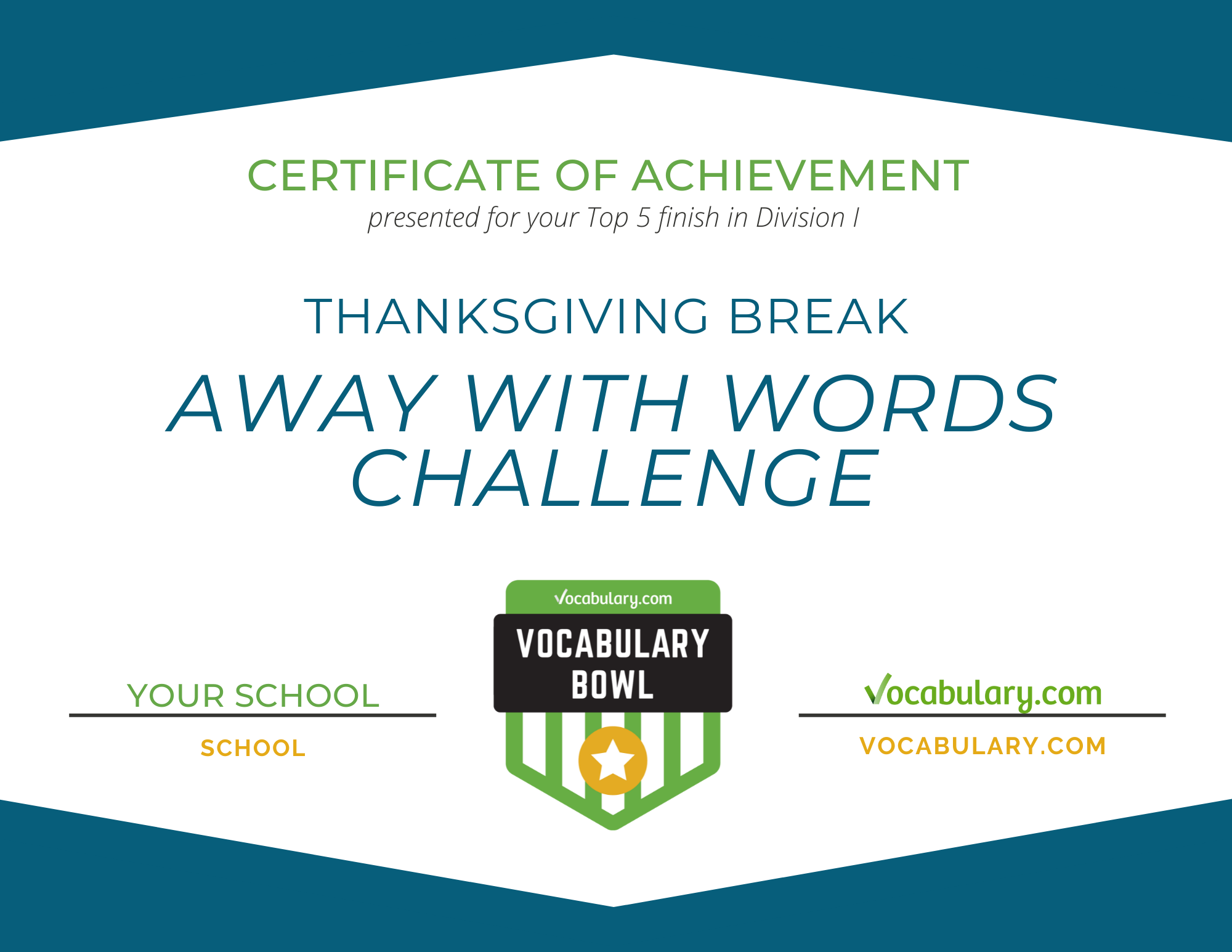 The schools that master the most words from November 22–28 and finish at the top of the Division I, II, and III leaderboards will be crowned the Thanksgiving Break Champions. It's a claim to fame which will earn them an official Vocabulary Bowl achievement certificate and hefty bragging rights. Certificates will also be awarded to the top 5 high schools and middle/elementary schools in Divisions I, II and III.