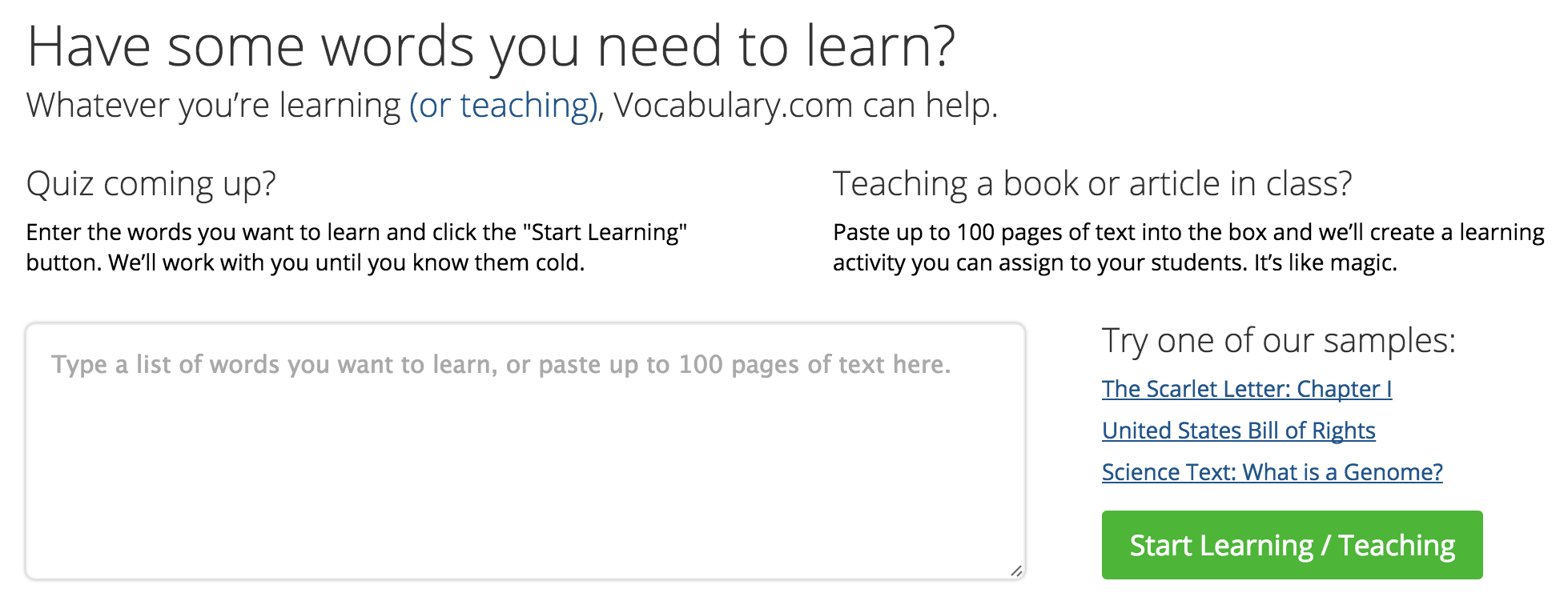 If you want to see how we grab vocab from a text, there are three sample texts from which to choose (Chapter 1 of The Scarlet Letter, the U.S. Bill of Rights, and a science text about genetics). Or just find your own text to copy and paste — from an article, book chapter, historical document, or whatever text you're learning (or teaching) from. Then, when you click the "start learning/teaching" button, we'll select appropriate vocabulary words from the text.