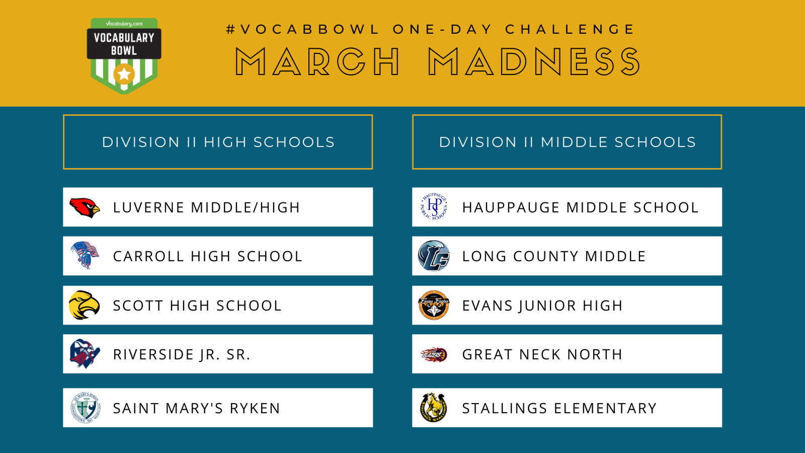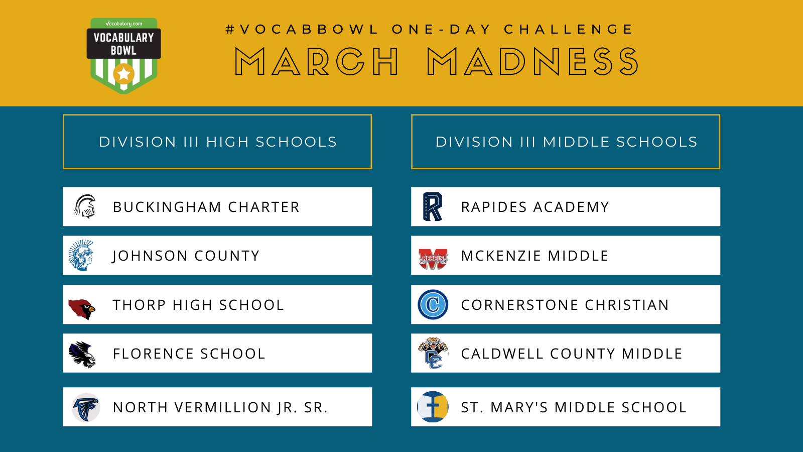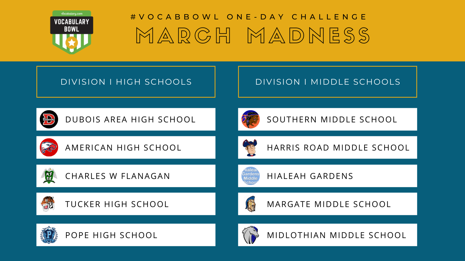 A huge thank you goes out to all the schools that competed in our special March Madness One-Day Vocabulary Bowl Challenge!