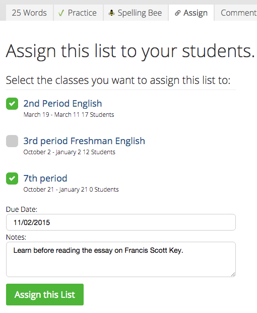To see how it works, go to any list in our library and click on the "Assign" tab. You'll see a list of all the classes you're currently teaching — check the boxes to assign the list to one or more of the classes displayed.