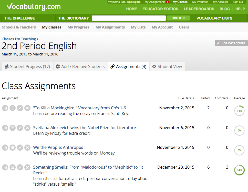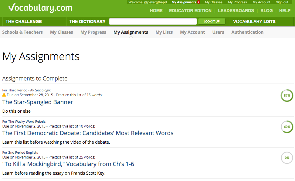 Anyone who signs up as an educator can take advantage of these new features and start assigning lists to their students today. And as always, if your school subscribes to our Educator Edition, you'll be able to drill down and get details on all of your students' progress and activity on Vocabulary.com. Find out more about the Educator Edition here.