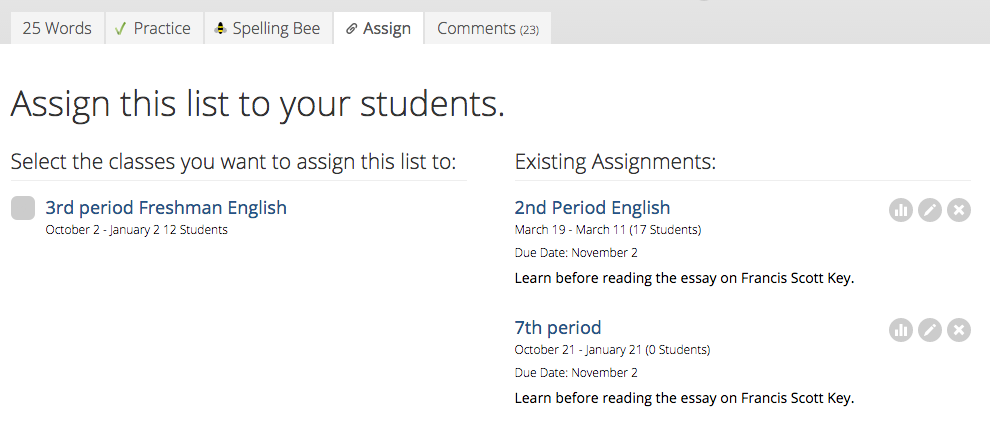 Return to a list's Assign tab anytime to see which classes you've assigned that list to. After you've assigned a list, this display will show you the due date and any instructions you've included. Use the icons at the right to view your students' progress on that list, edit the assignment, or delete it.