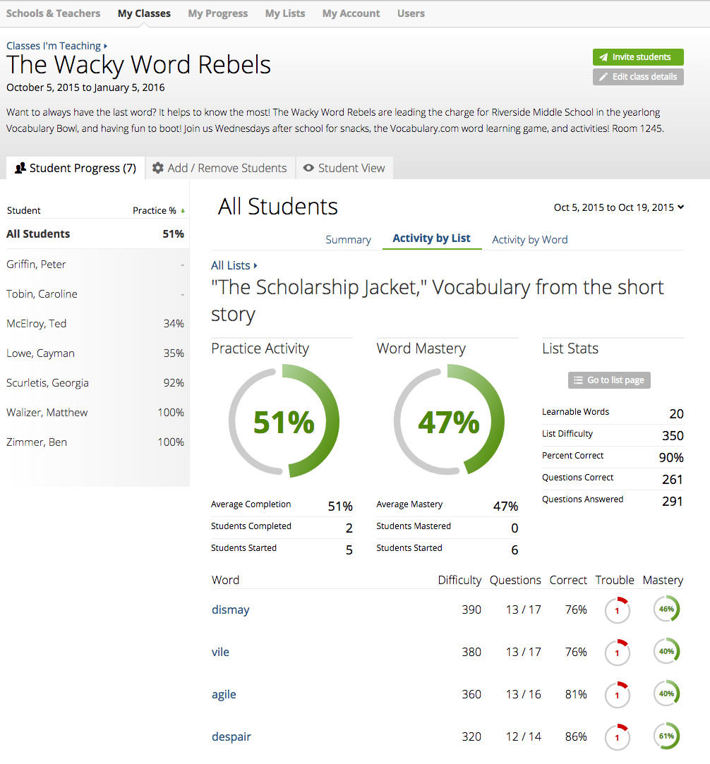 Again, you'll be able to use the icons to view the list itself, edit the assignment, delete it, or view student progress. This expanded view of student progress is one of the features of Vocabulary.com teachers find the most helpful. You can see how much activity there has been on the assigned list, how much word mastery, which words students' are having the most trouble with, and some helpful "List Stats," such as the number of learnable words on that list, the average difficulty of the words on the list, the number and percentage of questions students are answering correctly, and the number of questions that have been answered overall.