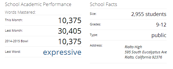 The profile page also includes the school's word mastery stats, including the number of words mastered this month, last month, over time, and during the course of the current Bowl, and a brief description and key facts about the school, helpful for anyone looking to check out their rivals. For recent monthly leaderboard winner Rialto High School in Rialto, CA, their profile looks like this: