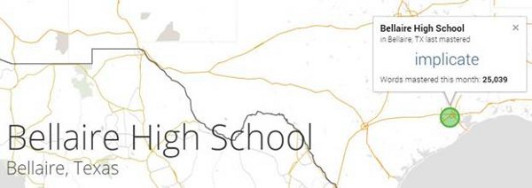 Right at the top of the profile page, schools can check out a personalized version of the larger Vocabulary Bowl word-learning map. While the larger map displays live, real-time updates of words being mastered in schools across the country, the personalized map updates to show just word mastery at the school. Take a look at profile page of recent daily leaderboard champ Bellaire High School in Bellaire, TX to see what this means.