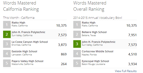 Another way to get those competitive juices flowing? See how your school stacks up in profile page leaderboards offering information such as state rank that don't display anywhere else on the site. Here the profile page for John H. Francis Polytechnic in Sun Valley, CA shows us that the school is ranked second in California this month, and third so far in the Bowl nationwide.