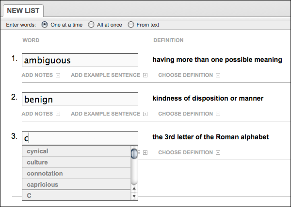 When you're making a new list, you'll have three options for entering words: one at a time, all at once, or from a text. If you enter words one at a time, then you'll see a box in which you can start typing your first word. Just like in the main Vocabulary.com search box, as soon as you start typing, we'll make our best guess at the word that you'd like to type before you've even finished, with lightning-fast results. When you have the word that you're looking for, we'll also provide a definition for the word, but you can click "choose definition" if you'd like to pick another one from the word's dictionary entry. You'll also find options for adding notes and example sentences for each word.