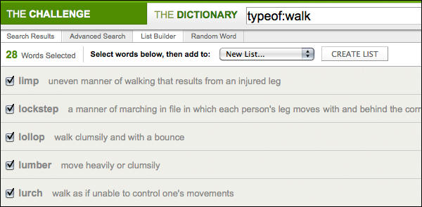 We've added some other cool bells and whistles, too. Let's say you're looking up words in the Vocabulary.com dictionary from the dictionary search box. At any time, you can click on "list builder" and start adding words to a new or saved vocabulary list. This is especially useful if you're using our "advanced search" feature, which allows you to find words that fit many different criteria, like parts of speech, letter combinations, rhymes, and number of syllables, or you can search for words that are related to other words by being a type of, example of, or part of something else. So, for instance, if you want to make a list of different ways of walking, all you need to do is enter "walk" in the "type of" box in advanced search, and then click "list builder" to start selecting any of the words that fit that description, whether it's amble, clomp, promenade, or trudge. We'll also preselect the definitions for the words to fit what you're searching for.