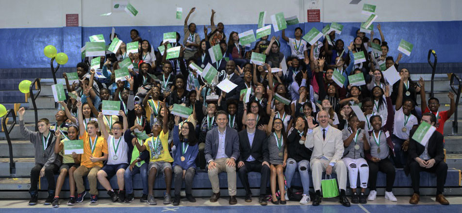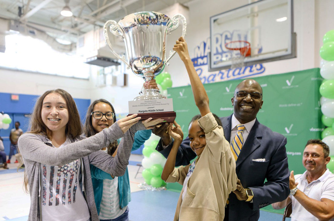 Margate Middle School celebrated its win in a high-energy ceremony kicked off by the Coconut Creek Drum Line and enlivened by the school's cheerleaders, band, step team and students who sang and rapped about Vocabulary.com. Hundreds of students and staff members packed the bleachers. The event was also attended by Margate Mayor Tony Ruzzano, other local officials, and Broward County school board members and district leaders.