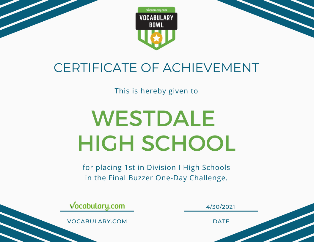 The schools that master the most words on April 30th and finish at the top of the Division I, II, and III leaderboards will be crowned the Final Buzzer Champions. It's a claim to fame which will earn them an official Vocabulary Bowl achievement certificate and hefty bragging rights. Certificates will also be awarded to the top 5 high schools and middle/elementary schools in Divisions I, II and III.