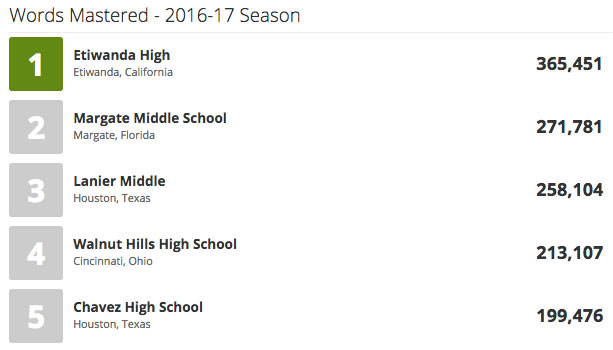 Now that the proverbial final buzzer has sounded, which schools topped the Leaderboards to claim victory? The Vocabulary.com team is certifying the official results, but we are proud to announce that the provisional Vocabulary Bowl Champion is Etiwanda High School of Etiwanda, California with a mind-blowing 365,451 words mastered. The provisional Runner Up and Middle School Champion is Margate Middle School of Margate, Florida with 271,781 words mastered.