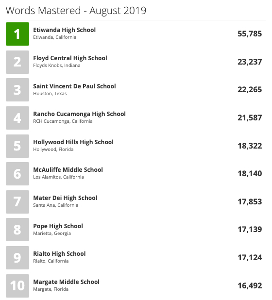 Case in point: Floyd Central High School from Indiana. The Highlanders rose in the ranks from relative obscurity, finishing last season at 102nd overall and therefore just off our radar, to become the North American Runner Up for August. The students at Floyd Knobs mastered a solid 23,237 words, posting their biggest total to date and establishing themselves as a Division I Top 10 contender and a serious threat to defending Indiana State Vocab Bowl Champs Plymouth High School in the upcoming 2019-20 season. September will be a critical month for the Highlanders, who've built some serious word-learning momentum that should help them offset the onslaught of effort that we usually see in the last month of pre-season play.