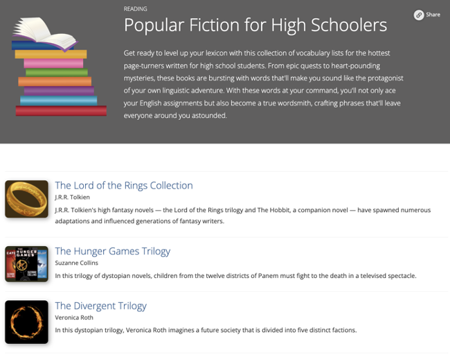 Vocabulary.com helps set students up for comprehension success when they read. Our extensive collection of vocabulary lists for novels, non-fiction texts, and more can help students master the most challenging and important words found in texts, allowing them to grasp the meaning of the texts more readily. Additionally, Vocabulary.com's focus on word mastery enables readers to discern subtle nuances in word meaning, tone, and connotation within the text. This helps students appreciate an author's choice of words and understand the subtleties of language, leading to a richer understanding of the text.