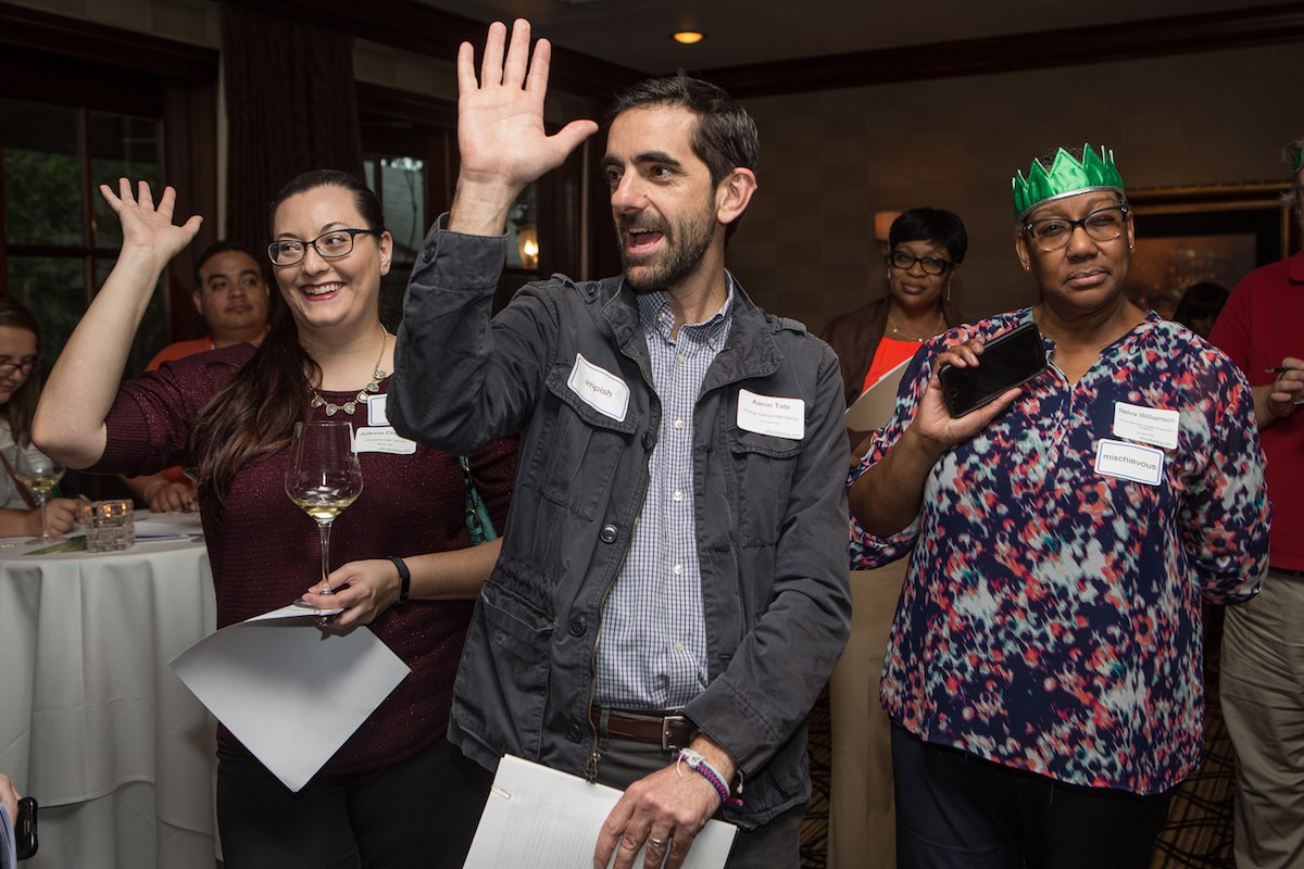 The first linguistic challenge was a virtual one — where attendees were riveted to their mobile devices while their furious fingers raced to see who could complete the Magical Mystery List first. The first to cross the finish line was science teacher extraordinaire Todd Guthrie of Beren Academy.