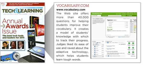 Last month, Vocabulary.com was granted an Award of Excellence by the K-12 technology and education magazine Tech & Learning. The award — announced in the magazine’s December issue — recognizes “both the ‘best of the best’ and creative new offerings that help educators in the business of teaching, training, and managing with technology.”