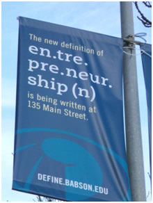 In 2011, the nearly century-old Boston-area college opened its first West Coast graduate business school in San Francisco, where it began festooning utility poles with ads that both invoke and challenge dictionaries. "The world needs a new definition of entrepreneurship," the Babson web copy announces — and you can write that definition yourself, right there on the web site. (Most of the submissions lead one to conclude that professional lexicographers are secure in their jobs. "Grabbing a life passion by the horns and sculpting it into a real business that adds value to others' lives," reads one "redefinition.")