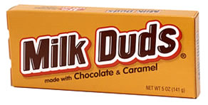 Over the next 70 years, Milk Duds passed from F. Hoffman to a variety of other owners, finally landing, in 1996, in the portfolio of Hershey Foods of Pennsylvania. Amazingly, neither Hershey nor any of the previous stewards of the Milk Duds brand ever changed the product name; it's one of those rare cases of a negative word acquiring positive associations through persistent marketing. (Virgin Airlines is another example.) The recipe, however, is a different story: In 2008 Hershey's switched to cheaper ingredients in Milk Duds and other candies, replacing cocoa butter with vegetable oil and prompting an outcry among fans of the brand.