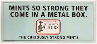 The British breath-mint brand Altoids, founded in 1780, has since the 1920s used the slogan "The Original Celebrated Curiously Strong Mints." When the brand began to advertise heavily in the U.S. in the mid-1990s, "curiously strong" was prominently featured.