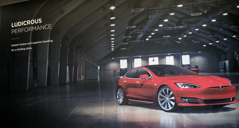 I've encountered a lot of descriptors for automobiles – bold, agile, powerful, dynamic, sleek, legendary, peppy, energy-efficient – but until recently I'd never seen a car described, approvingly, as ludicrous. Yet that was exactly what the big display said in the Tesla showroom in the Americana shopping center in Glendale, California: Ludicrous performance.