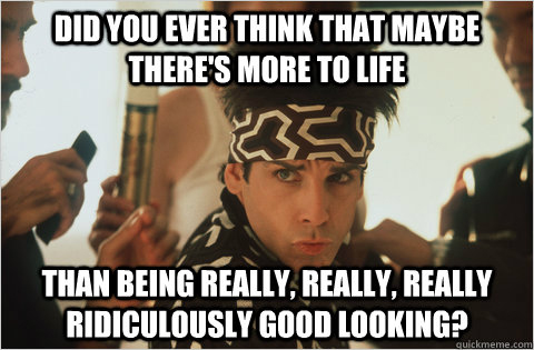 Zoolander, you may recall, is the 2001 comedy directed by and starring Ben Stiller as Derek Zoolander, an "intellectually challenged but bone structure-blessed male model" (as Rotten Tomatoes puts it). Derek Zoolander tells an interviewer that he first realized he could be a model when, as a child, he caught sight of his reflection. "Wow, you're ridiculously good looking!" was his reaction. Later, in what passes for a moment of introspection, he observes: "I'm pretty sure there's a lot more to life than being really, really, ridiculously good looking. And I plan on finding out what that is." The repeated line became a popular catchphrase and a social-media meme. When Zoolander 2 was released in 2016, "ridiculously good looking" appeared in many headlines.