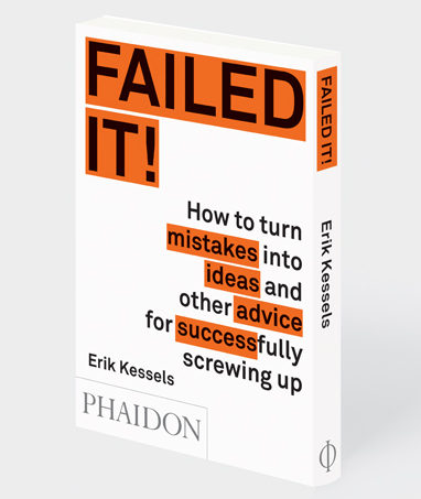 This boosterish spirit reaches a sort of apotheosis in Failed It!, published in 2016 by Erik Kessels, the founder of a communications agency with offices in Amsterdam and Los Angeles. Intended as "an inspirational guide for creatives, students, and young professionals," Failed It! exhorts readers to "Seek out failure. Train yourself to recognize it all around you. Get to know it and take it away for a romantic weekend. Failure isn't fatal – quite the contrary. It's downright fabulous." To visually prove the point, the book is bound with a backward-facing cover.