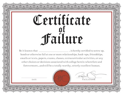 We're seeing this upbeat sense of failure in new idioms like failing up, failing forward, and failing fast. It's in the titles of recently published books (The Gift of Failure) and of TED talks ("Smart Failure for a Fast-Changing World"); in brand names (Fail Chips) and in a conference for entrepreneurs (FailCon, which began in 2009); and even in a new course for Smith College overachievers called "Failing Well." Here on the Visual Thesaurus, Daphne Gray-Grant recently wrote about "Why We Should Want to Fail as Writers" ("because mistakes show you're pushing yourself").