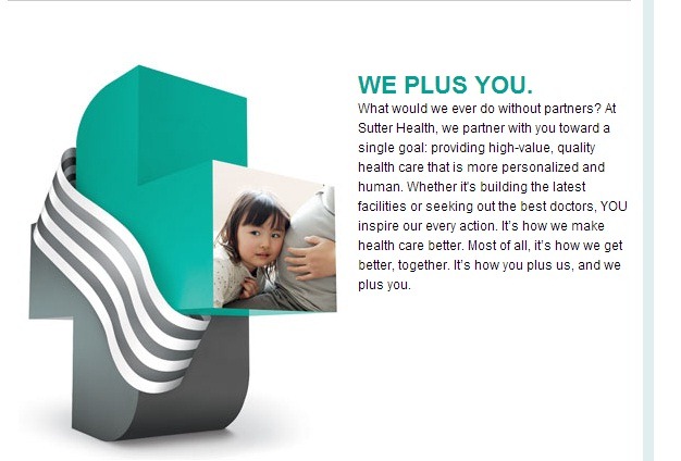 "At Sutter Health, we believe in partnering with you," says the voiceover. "Because you plus us ... and we plus you." Translation: We make each other's lives better.