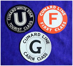 Luggage labels denoting classes on the Cunard steamship line. Via eBay.