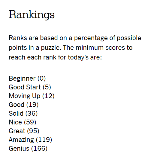 The Bee is both a vocabulary game and a pattern-finding challenge; in the latter respect, it resembles Scrabble. Are there productive letter combinations, such as UN, ING, or ED, that can be used to create multiple words? Do you remember that -ULE is a suffix meaning "small," as in VENULE, a small vein? Does an abundance of vowels suggest foreign-language imports such as AIOLI and LUAU? Solvers find satisfaction in tracking their progress in each day's game, beginning with "Good Start" and proceeding through "Nice" and "Amazing." "Genius"level is rewarded with a bee icon — she has a name: Beeatrice — wearing a mortarboard.
