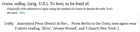 The OED updates its definition of heart as a transitive verb by adding references to the heart logo, which originally signaled "love," and later included the more literal "heart" as well. What's missing from this definition is the idea that reading ♥ as "heart" instead of "love" adds a touch of irony to the logo.