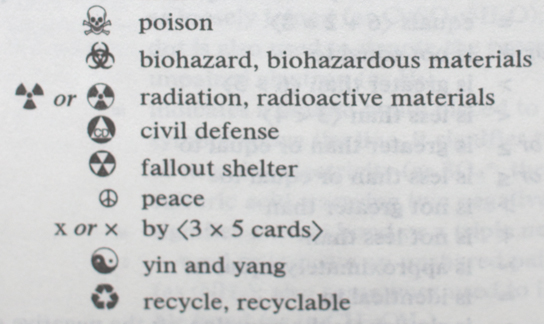 Above: Speaking of spells, an illustration and definition of abracadabra, from Nathan Bailey's Dictionarium Britannicum (1736). Below: Merriam-Webster's New Collegiate Dictionary (11th ed., 2004) defines a variety of graphic symbols in an appendix, including the symbols for poison, radiation, peace, and recycling. The dictionary does not define the heart or the smiley face, both of which were in wide use at the time.