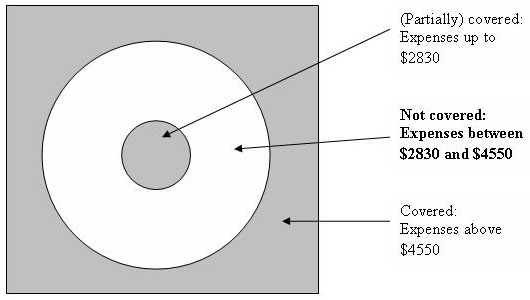 The doughnut actually is a pretty good metaphor for one aspect of modern health care, just not Medicare prescription drug coverage. It could stand for your own medical insurance policy. The doughnut hole is the annual deductible for your plan — the uncovered costs that fall below a certain minimum. The doughnut itself is the medical expenses that your insurance company covers once you've met your deductible. And beyond the doughnut lie the medical expenses incurred after you've reached your annual coverage limit.