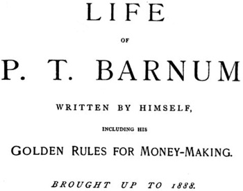 To our modern sensibilities, an autobiography that includes "golden rules for money-making" may seem unutterably crass. But the business of getting the attention of the public was a completely different enterprise in Barnum's day than it is in ours, and it is only fair to evaluate Barnum against the backdrop of his times. Modern impresarios, thanks to Internet technology, have a wide range of outlets through which they can make a bid for public attention with virtually no barrier to entry. In addition, there exists today an entire industry that stands ready to help the individual who (armed with a sufficient amount of cash or credit) wishes to grow an audience, or to become a fixture in the mind of the public. Barnum, by contrast, masterminded and executed his vast promotional machinery mainly by himself, and he had only one dependable medium for reaching a public beyond his immediate environment: the press. One of Barnum's biographers notes that Barnum played the press "like a calliope," and this does not seem to be an exaggerated claim. The press adored Barnum, giving no end of attention to his many successes and few failures. From the time he was a young man he was almost never out of the public eye, whether promoting himself, his own writings, or his various and largely successful commercial enterprises.