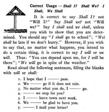 He then goes on to delineate the distinctions between shall and will, rendered in various constructions as should and would, for three pages, during which the modern reader will come to lament that an important distinction of modality available to earlier refined speakers of English is now lost: Fowler has it that will was reserved for use in sentences where "intention, volition, choice, etc" are involved, while shall is for use in sentences of "plain future or conditional statements & questions in the first person." But is the distinction really lost, and perhaps more importantly, did it ever really exist? David Crystal, in his update of this entry, says that there is abundant evidence of this distinction being