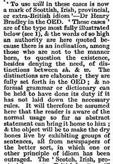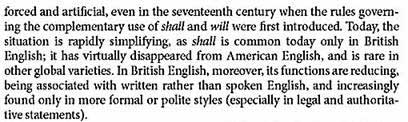 He then goes on to delineate the distinctions between shall and will, rendered in various constructions as should and would, for three pages, during which the modern reader will come to lament that an important distinction of modality available to earlier refined speakers of English is now lost: Fowler has it that will was reserved for use in sentences where "intention, volition, choice, etc" are involved, while shall is for use in sentences of "plain future or conditional statements & questions in the first person." But is the distinction really lost, and perhaps more importantly, did it ever really exist? David Crystal, in his update of this entry, says that there is abundant evidence of this distinction being